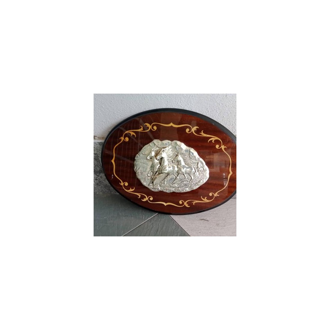 Capezzale quadro ovale laminato in argento 952 in basso rilievo a firma Rotondo su base in legno con intarsio anni 60 cm 39x29 cavalli vintage