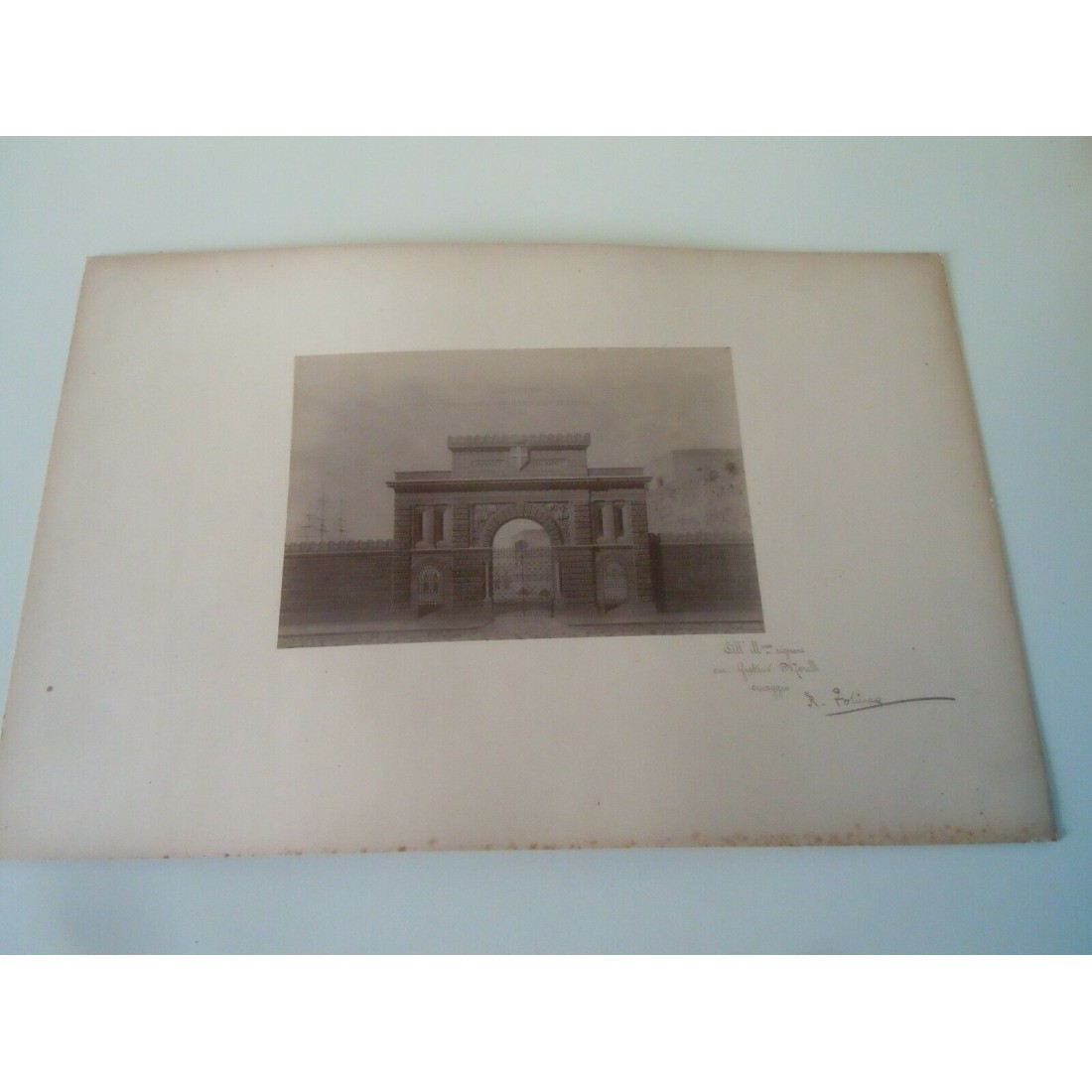 Napoli progetto della porta dell' arsenale architetto ingegnere Folinea incisione di fine 800 cm 24x16.5 su cartoncino cm 50x33 con firma del progettista