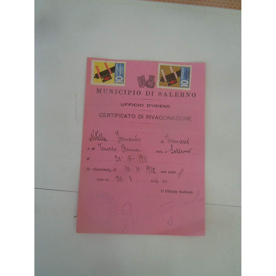Municipio di Salerno certificato rivaccinazione con antitubercolari del periodo fascismo cm 19x14 in buone condizioni piega centrale di chiusura