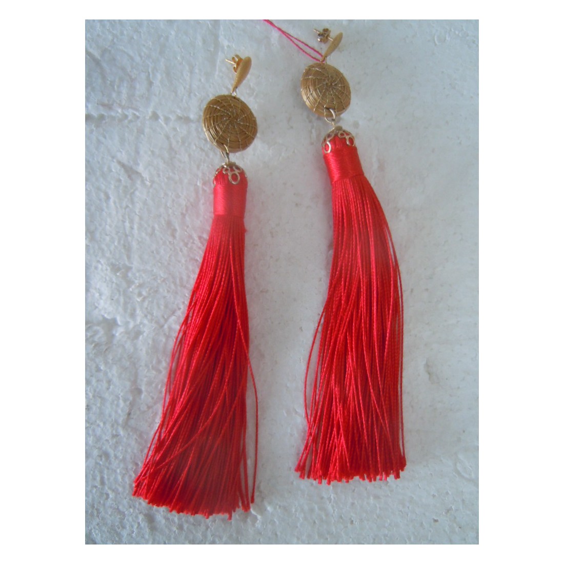 Orecchini pendenti in oro vegetale con nappa fiocco rosso gioielli artigianali di alta qualità prodotto in Italia lunghezza totale cm 16